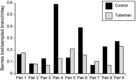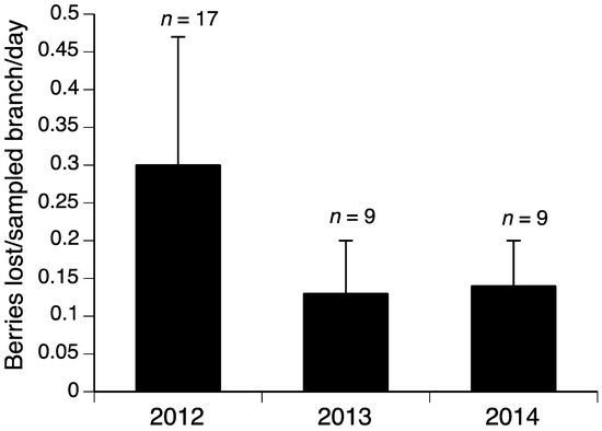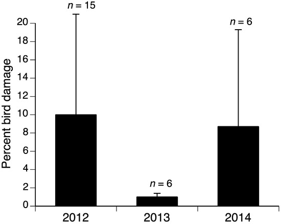 24] (p. 35). The bird damage patterns reflect this varying abundance of fruit over the years with a lower percent damage in 2013 and 2014 and the highest in 2012 (
