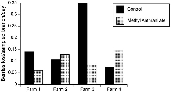 11]), which is potentially because any irritation caused by methyl anthranilate sprays is short-term and birds can move away from treated fruit; thus, they do not learn to avoid it, because they are not exposed to large dosages [