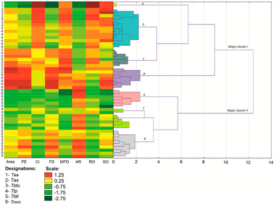 A heat map and the results of cluster analysis of kernel shape descriptors in the analyzed wheat species. PE—perimeter, CI—circularity, FD—Feret diameter, MFD—minimal Feret diameter, AR—aspect ratio, RO—roundness, SO—solidity, Taa—T. aestivum ssp. aestivum, Tas—T. aestivum ssp. spelta, Ttdu—T. turgidum ssp. durum, Ttp—T. turgidum ssp. polonicum, Ttdi—T. turgidum ssp. dicoccum, Tmm—T. monococcum ssp. monococcum, a, b, c, d, e, f, g—minor cluster name.