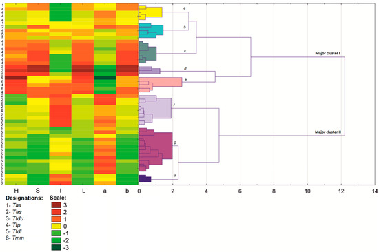 A heat map and the results of cluster analysis of kernel color descriptors in the analyzed wheat species. H—hue, S—saturation, I—intensity, L*—luminance, a* indicates redness–greenness and b* indicates yellowness–blueness, Taa—T. aestivum ssp. aestivum, Tas—T. aestivum ssp. spelta, Ttdu—T. turgidum ssp. durum, Ttp—T. turgidum ssp. polonicum, Ttdi—T. turgidum ssp. dicoccum Tmm—T. monococcum ssp. monococcum, a, b, c, d, e, f, g, h—minor cluster name.