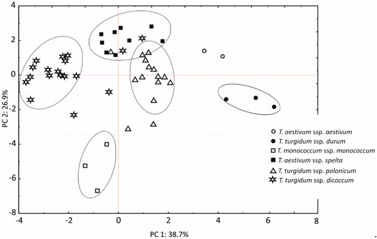 Principal component analysis strongly discriminated three species: bread wheat, durum wheat, and einkorn. In the remaining wheat species, individual lines were grouped with other taxa, which could be due to similarities in the degree of ploidy (Polish wheat and emmer), as well as significant intraspecific variations in Polish wheat, which could explain the grouping of one Polish wheat line with spelt. However, it should be noted that most Polish wheat lines were positioned in the middle range of the values noted in the remaining species.
