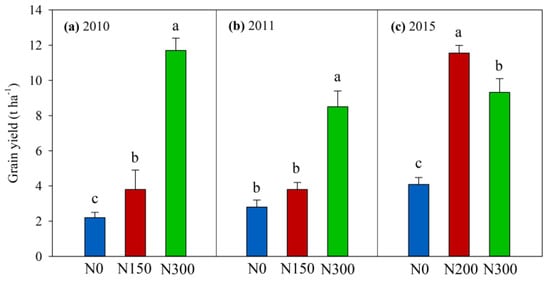 Maize grain yield in response to different nitrogen treatments in 2010 (a), 2011 (b), and 2015 (c) (adapted from [8] and [13]). N0, N150, N200 and N300 represent N treatments that received a total of either 0, 150, 200, or 300 kg N ha−1. Nitrogen was applied as single application (N150) or as split applications (N200, N300). Vertical bars represent the standard error of four replications. Different letters above column indicate significant differences between nitrogen levels by LSD test (p < 0.05).