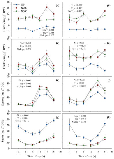 Diurnal dynamics of glucose, fructose, sucrose and starch concentrations in ear leaf at silking (a,c,e,g) and 20 days after silking (b,d,f,h) in 2015. Vertical bars represent the standard error of four replications. N0, N200, and N300 represent N treatments that received a total of either 0, 200, or 300 kg N ha−1 applied as split applications. N, N treatment; T, timepoint.
