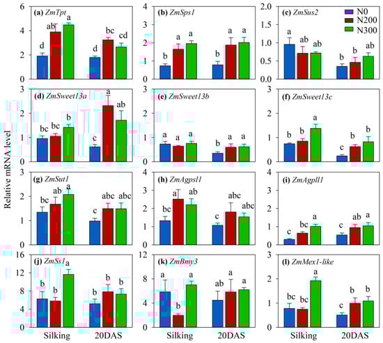 Of the genes encoding enzymes of starch biosynthesis, significant treatment effects were observed between N0 and N200 at silking for ZmAgpsl1 (Figure 3h). Additionally, the relative transcript abundance of ZmAgpll1 increased significantly in N-fertilized treatments at both silking and 20 DAS, while that of ZmSs1 was significantly higher in the N300 compared to the N0 treatment at silking but not at 20 DAS (Figure 3i,j). Relative transcript level abundance of beta-amylase (ZmBmy3) exhibited an inconsistent response to N treatment at silking and did not differ at 20 DAS (Figure 3k). In contrast, the relative RNA levels of the maltose exporter gene (ZmMex1-like) were greater in the N300 than the N0 treatment at both silking and 20 DAS (Figure 3l).