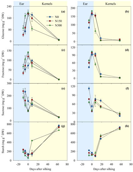 Temporal dynamics of glucose, fructose, sucrose and starch concentrations in the developing ear and kernels in 2010 (a,c,e,g) and 2011 (b,d,f,h). Day 0 indicates silking. Vertical bars represent the standard error of four replicates. Please note that carbohydrate concentrations were measured in the developing ears before and at silking, and in the kernels after silking. N0, N150, and N300 represent N treatments that received a total of either 0, 150, or 300 kg N ha−1, with fertilizer in the N300 treatment applied as split application.