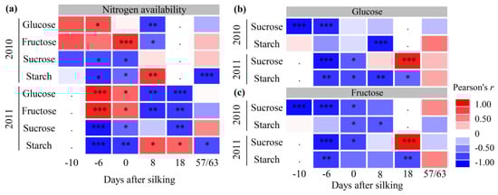 Pearson correlation coefficients between soil N availability and carbohydrate (a), between glucose and sucrose or starch (b), and between fructose and sucrose or starch (c) in developing ear in 2010 and 2011. Dots = not measured. *, p < 0.05; **, p < 0.01; ***, p < 0.001.