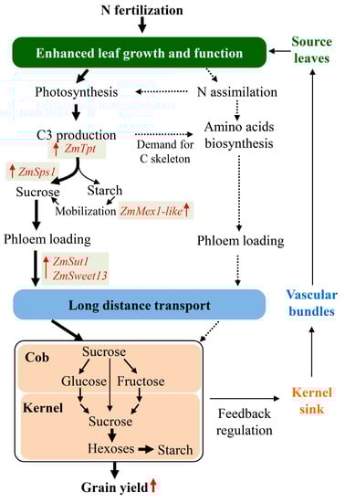 Schematic of a proposed metabolic pathway showing the source-sink carbon partitioning in determining the grain yield in maize under nitrogen fertilization.