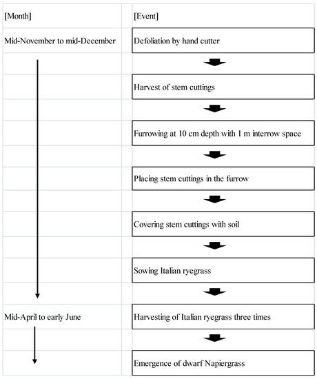 A flow chart of the propagation of cuttings of dwarf Napiergrass in the winter season is presented in Figure 1. Stem cuttings of hardened elongated internodes of dwarf Napiergrass were obtained by defoliating leafage using a hand cutter during the period from late November to December. Therefore, one stem cutting typically had more than 10 nodes. We furrowed to a 10 cm depth with 1 m interrow spacing, where we placed stem cuttings and covered them with soil. Thereafter, IR was sown by broadcasting at 2 g/m2 without pressing the soil with a land roller to avoid the risk of exposing stem cuttings above the ground. IR was harvested three times monthly from April to June, after which dwarf Napiergrass would emerge to complete the grassland establishment.