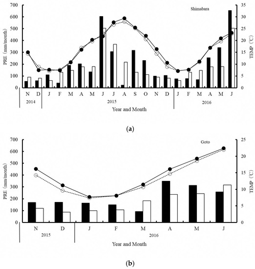Changes in the monthly meteorological parameters of daily mean air temperature (TEMP) and precipitation (PRE) during the experiment in 2014–2016 and in a normal year (NY), averaged in 1980–2010 at the Shimabara site and averaged in 2006–2015 at the Goto site. TEMP: 2014–2016 (●), NY (○), PRE: 2014–2016 (■), NY (□); (a) Shimabara site, (b) Goto site.
