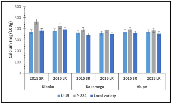 Varietal differences on the grain calcium content of finger millet at Kakamega, Alupe, and Kiboko during the short (SR) and long (LR) rains seasons of 2015.