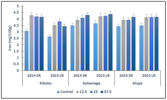 Significant differences (p ≤ 0.05) between phosphorus treatments were observed in all the sites for both seasons on the grain iron content of finger millet (Figure 2). The control had lowest iron content in all sites with the phosphorus-treated plots showing different trends across sites. At Kiboko, P treatments did not show significant differences during the short rains where 12.5 kg ha−1 P2O5 rate elicited highest iron content (4.3 mg/100 g). In the long rains season, highest rate (37.5 kg ha−1 P2O5) exhibited a significant decrease in iron content after 25 kg ha−1 P2O5 level where the highest iron content was observed. At Kakamega, there was a linear increase on the iron content with increasing phosphorus level for both seasons, however, there were no significant differences between the phosphorus treatments.