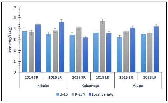 The influence of variety on the grain iron content of finger millet at Kiboko, Kakamega, and Alupe during the short (SR) and long (LR) rain seasons of 2015.