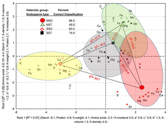 The association in each root between centroids and loadings of physical attributes, biochemical constituents, and nutrients, suggested that accessions within the SSO have larger values for those attributes and constituents with negative loadings on Root 1 and Root 2. Accessions of the NSO, NST, and SST, in decreasing order, have larger values of kernel attributes and constituents with positive loadings on Root 1. The same reasoning can be applied to loadings on Root 2. Nutrients in accessions within each HGE clustered around its centroid in accordance with its percent correct classification. The association of a few nutrients (e.g., [C and K] in NST, NSO and SST) with their HGEs centroids was weaker than most nutrients; thus contributing to smaller percent correct classification of HGEs.