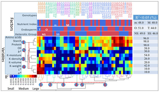 Y-axis). Cluster (1) was composed of amino acid, starch, and protein values, cluster (2) joined oil and
