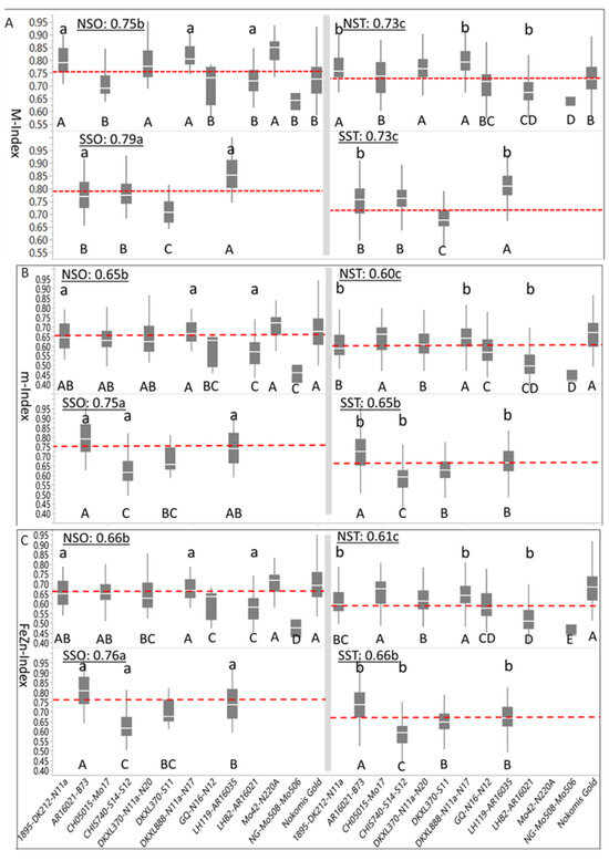 Figure 3A). Mean M-Indices of four and six genotypes for the NSO and NST were above the average of their respective HGE means, respectively, whereas one and three genotypes had above average M-Indices for the SSO and SST, respectively. Mean M-Indices for individual genotypes of the NSO were separated into two (