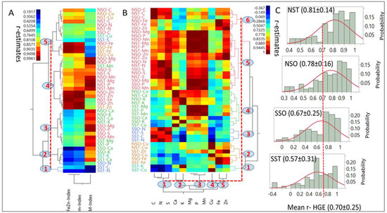 In addition, differences (p < 0.002) in R2 were found between SS (0.34) and NS (0.59), but not between OE (0.51) and TE (0.43) textures (p < 0.38). However, when HGEs were considered, the R2 for NST (0.62) and NSO (0.57) differed (p < 0.01) from SST (0.24), but not from SSO (0.44), which in turn did not differ from NSO or NST. The R2 estimates for genotypes ranged from 0.09 for Cu, to 0.91 for S. Three nutrients had R2 values between 0.60 and 0.66 [Mg, P, and Mn], while Ca (0.46) and Zn (0.42) R2 values were intermediate. The R2 estimates for M-Index (0.48) and m-Index (0.38) did not differ significantly from each other. However, at the genotypic levels, estimates differed significantly (p < 0.01) between SS and NS, respectively for RMSE in Cu, (0.51 and 0.37) and β2 (0.0012 and 0.0035); in Fe for RMSE (4.00 and 2.68), β1 (−0.30 and −0.65), and R2 (0.09 and 0.47); in S for RMSE (54.5 and 36.1); and in Zn for RMSE (2.76 and 1.75), β1 (−0.28 and −0.64), β2 (−0.005 and 0.17), and R2 (0.19 and 0.65). Also, m-Index estimates in SS and NS, respectively, differed (p < 0.01) for RMSE (0.095 and 0.060), β1 (−0.008 and −0.020), and R2 (0.15 and 0.60). On the other hand, differences (p < 0.05) between OE and TE textures were limited to S.D. for Ca (54.4 and 43.7), R2 for Cu (0.01 and 0.17), SD for Fe (3.5 and 3.9), and mean K (3680 and 3520). The estimated M-Index and m-Index averages for NS (0.745 ± 0.02; and 0.628 ± 0.04, respectively) were (p < 0.05) smaller than the respective SS (0.763 ± 0.02; and 0.705 ± 0.04) estimates; however, the respective R2 values were not different.