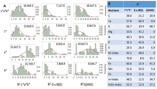 Figure 6B). Averaged over nutrients, *, G × IB(E), and G(HGE) explained 43.0, 35.7, and 12.4% of variation, respectively. The respective averages for micronutrients were 51.7, 16.8, and 33.5%. Some (but not all) averages were in line with R