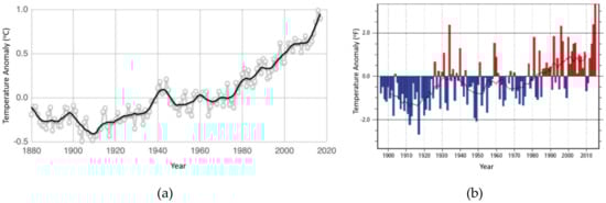 (a) Global temperature anomalies from 1880–2016, electronically available from National Aeronautics and Space Administration, Goddard Institute for Space Studies (NASA/GISS, on 29 June 2017) [7]; (b) California statewide mean temperature departure, October through September as reported by California Department of Water Resources in 2015 [8]. The black line denotes the 11-year running mean.