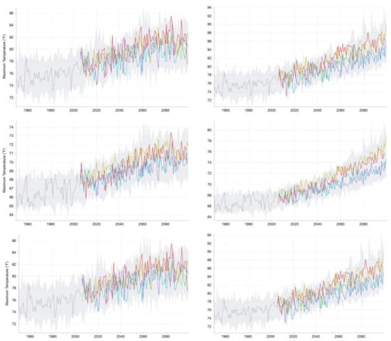 The historical and projected maximum temperatures (°F) in California for the period 1950–2099 for Shasta, Sacramento, and Los Angeles County (top to bottom). Left: projection based on Representative Concentration Pathways, RCP4.5 and right: RCP8.5. Extracted from Cal-Adapt interactive web portal [13].
