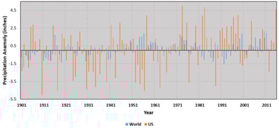 Precipitation anamoly from 1901 to 2015 over the land areas: worldwide and in the United States. Information presented are gathered from Climate Change Indicators: U.S. and Global Precipitation electronically published by U.S. Environmental Protection Agency (EPA) [17].