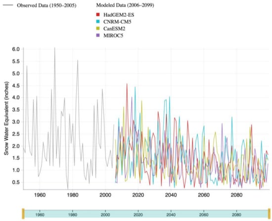 Snow water equivalent time series for the observed and projected time-period. Extracted from Cal-Adapt interactive web portal [13].