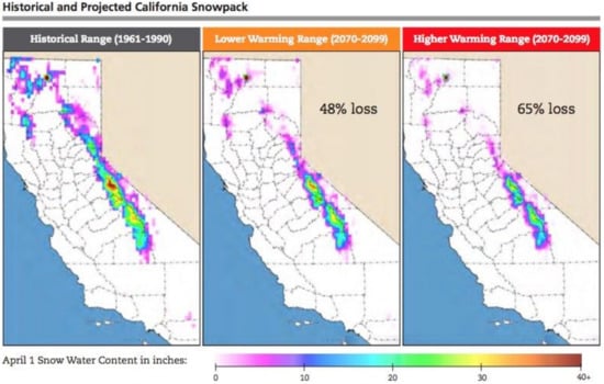 Historical and projected snow pack for the Sierra Nevada. Adopted from “California Climate Science and Data for Water Resources Management” published by California Department of Water Resources in 2015 [21].