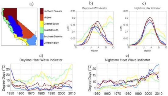 (a) California sub-regions derived from daily Heat Wave Index (HWI) variability. (b,c) The seasonality of observed daytime and nighttime heat waves for each California sub-region and (d,e) time series of the seasonal daytime and nighttime heat wave index shown smoothed with a 5-point running mean. The colors in (b–e) correspond to the sub-regions in (a) [26]. Copyright © 2012 John Wiley and Sons, Indianapolis, IN, USA.