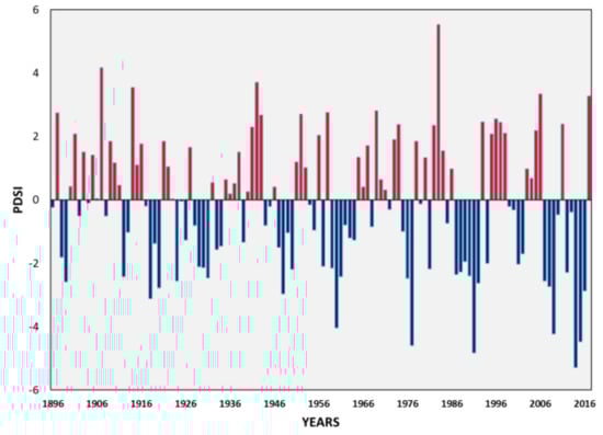 The Palmer Drought Severity Index (PDSI) for California for the months of December, January, and February from 1896 to 2016. Modified graph based on the information provided by NOAA [15] accessed on 3 July 2017.