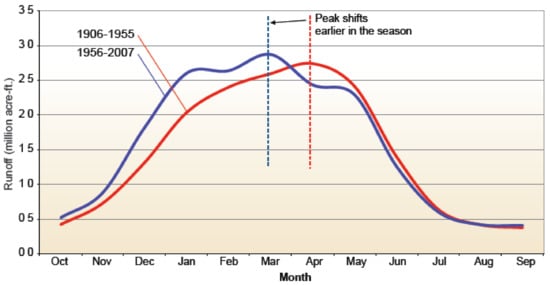 The California Department of Water Resources (DWR) reported that the start of runoff events in California’s largest watershed, the Sacramento River System, has been occurring earlier in the season [21] over the last century. The peak monthly runoff before 1955 (red line) happens to occur nearly a month earlier than after 1956 (blue line) implying that this key hydrology metric is no longer stationary (Figure 9). One conclusion of this is that peak runoff time will occur earlier in the year, reducing the ability to refill reservoirs after the flood season is over.