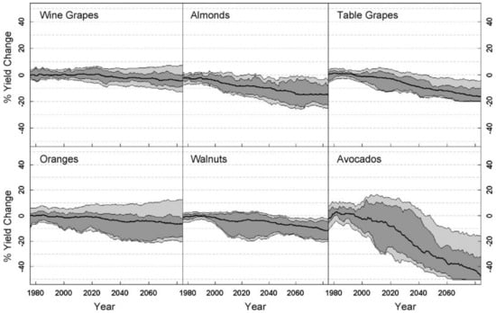 The impacts of climate change on annual crop yields are typically analyzed with a process-based model, in which analyses of many perennial crops typically involve statistical models [34]. The relationship between crop yield and climatic variables such as minimum temperature, maximum temperature, and precipitation for twelve major California crops (wine grapes, lettuce, almonds, strawberries, table grapes, hay, oranges, cotton, tomatoes, walnuts, avocados, and pistachios) was derived from historical records from 1980–2003 using regression models [36]. These climatic trends have mixed effects on crop yields for orange, walnut, and avocado, as compared to other crops. Figure 10 shows how climate change is expected to impact yields of almonds, walnuts, avocados, oranges, and grapes by 2050. Median projections for wine grape yields exhibited very small changes over the next century due to climate change, while the other five crops exhibited moderate to substantial yield declines. The impact of climate uncertainty on projections was substantial but not overwhelming. While uncertainties were slightly negative, the differences in climate uncertainty between crops reflect the fact that each crop responds in different ways to climate uncertainties.