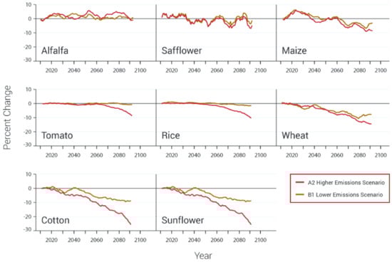 Crop yield response to warming in California’s Central Valley based on higher emission scenario (A2) and lower emission scenario (B1) [40,41]. Copyright © 2006 Elsevier, Amsterdam, Netherlands.