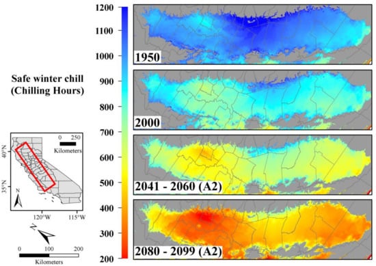 Figure 12 portrays historic and projected future changes in winter chill in California according to two different chilling models: chilling hours and dynamic models [44]. This research aimed at determining time-line management measures, such as the spraying of dormancy-breaking chemicals, as a predictor of crop yield potential for the season. The study reported that climatic conditions by the end of the 21st century would no longer support some of the main tree crops currently grown in California. As seen in Figure 12, winter chill hours in 1950 and those projected to occur between 2080 and 2099 will vary spatially between the Sacramento and San Joaquin valleys.