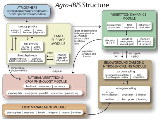 Over the recent decades, researches have been performed on carbon budgets in managed ecosystems at different scales using various methods including process-based models [14,15,16,17,18]. However, there is still lack of understanding of the magnitude and spatial-temporal patterns of carbon fluxes due to human-involved processes and less reliable data. Agroecosystems have been reported as a carbon sink, as increased crop yields and intensified management practices have led to accumulations of carbon [19,20]. Carbon dynamics in these systems are important for the global terrestrial carbon budget [21,22], but it is challenging to quantify carbon fluxes at a larger scale because of the variability in climate and environmental conditions [23,24,25]. Numerical models can describe land atmosphere interactions and quantify carbon budgets at multiple scales, from regional to global [26,27,28]. Until recently, many biosphere models have approximated agricultural ecosystems [29,30,31]. Some biosphere models have incorporated different agroecosystems into their traditional representation of natural vegetation. There have also been several other ecosystem process models (e.g., CLASS and GLAM) that incorporate agroecosystems into regional climate models [32,33,34,35,36]. Another example is a process-based dynamic agro-ecosystem model, called Agro-IBIS, that is agricultural version of the Integrated Biosphere Simulator (IBIS) [37]. Agro-IBIS can simulate the bio-geophysical processes and agricultural management impacts for specific plant types in natural and managed ecosystems at local, regional, or global scales. The simulation of annual crops (maize, wheat, soybean, sugarcane, etc.) using the Agro-IBIS model has been evaluated in several studies. For example, Kucharik and Twine validated the model using surface flux measurements of carbon, water, and energy at AmeriFlux eddy covariance site in Mead, Nebraska [23]. Twine and Kucharik validated Agro-IBIS by simulating the vegetation phenology in comparison to the satellite information of greenness [38]. Webler et al. evaluated the model by simulating carbon, water, and energy fluxes at an experimental soybean site in southern Brazil [39]. Generally, these models were calibrated for specific sites. However, revalidation of the model is essential before application to different regions due to the variability in soil, climate, and crop conditions. Such validation provides important information about model performance and uncertainty.