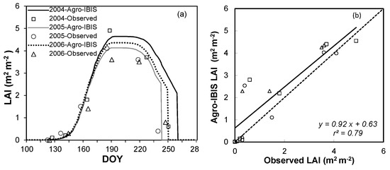 LAI is significant for crop simulations, and has direct effects on the fluxes of energy, water, and carbon. LAI observations collected at the WAS site were used to evaluate the ability of Agro-IBIS model to simulate leaf growth in different periods. In Figure 2, the observed and simulated LAI values for maize were compared. These results indicated that the simulated LAI values by Agro-IBIS agreed well with measured LAI values. The model captured the rapid rate of LAI increases with slight underestimation from the period after planting to the end of June in 2004 and 2005. However, it overestimated LAI by an average of 27% in 2006. The model had difficulty in estimating the LAI from the beginning of August until the end of September across all years, but it performed better for peak LAI, simulating with delay or advance in a time of maximum LAI by a few days and the magnitude within 0–10%. For maize simulation, RMSE (root mean square error) and r2 (correlation coefficient) values for overall comparisons of Agro-IBIS against the observed data were 0.98 m2 m−2 and 0.79, respectively.