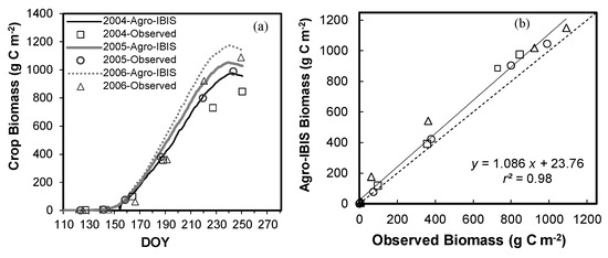 Biometric measurements of aboveground vegetation biomass (converted to carbon) and simulated biomass carbon were compared to evaluate the performance of Agro-IBIS model. Figure 3 shows the comparison of total simulated aboveground crop biomass (including leaf, stem, and reproductive biomass carbon) and observed values of carbon (calculated by multiplying the dry weight by 0.45 [55]) in each year for maize. The predicted values by the model were found to be acceptable for maize. The biomass carbon values in maize were closely simulated in the growing season. However, the predicted biomass carbon was overestimated by 15%, 8%, and 16% in 2004, 2005, and 2006, respectively. The total simulated aboveground biomass carbon at harvest was 791.2 g C m−2 (averaged over the 3 years), among which leaves, stems and reproductive biomass for maize were 118.4, 288.3, 384.5 g C m−2, respectively. Further testing for Agro-IBIS was performed by the comparisons of the simulated biomass values against the measured values. The overall r2 relevant to all total aboveground crop biomass values was 0.98, and the RMSE value was 67.2 g C m−2.
