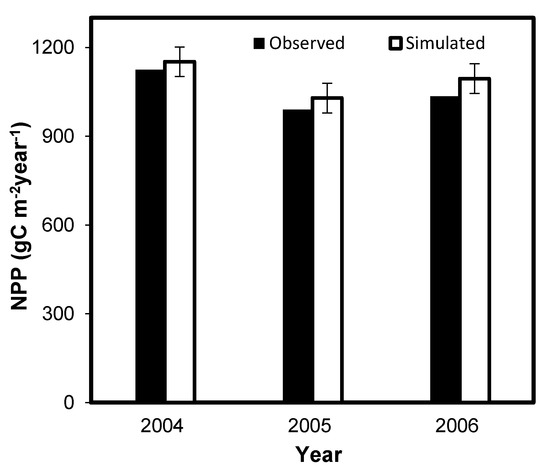 Figure 4 shows the comparison between the simulated NPP by Agro-IBIS and the estimated NPP by observed crop yield based on the method described in Section 2.2. The model-simulated NPP was consistent with the measured NPP in each year, despite the overestimation of observed values by an average of 12.6% across all years. It indicates that the Agro-IBIS model could correctly represent the inter-annual variability in the measured NPP. The simulated annual NPP averaged 1252, 1098, and 1245 g C m−2 year−1 for 2004, 2005, and 2006, respectively, while the observed values were 1125, 990, and 1035 g C m−2 year −1.
