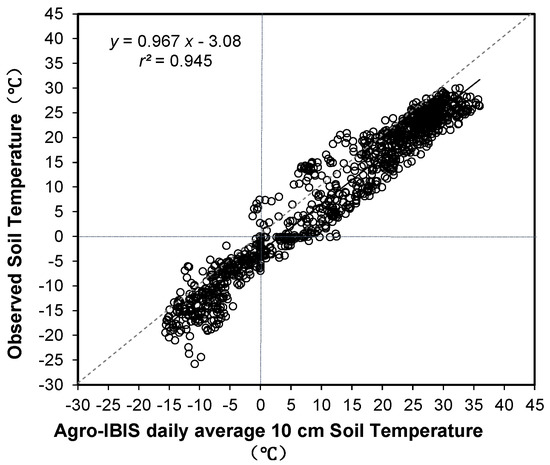 The modeled and observed daily average soil temperatures (0–10 cm) were compared. Their correlation yielded an r2 value of 0.96 for maize at the WAS site. The statistical value and the seasonal changes of soil are shown in Figure 5. It indicated that Agro-IBIS could capture seasonal changes in soil temperature. However, the model overestimated soil temperature in each year from early winter until late March (Figure 5). The daily average values of observed soil temperatures were 8.8, 8.8, and 9.5 °C in 2004, 2005, and 2006, respectively, compared to 12.8, 12.9, and 13.4 °C for the simulated values. It is revealed from the regression of simulated and measured daily soil temperature (Figure 6) that the model overestimated the soil temperature approximately by 4 °C, even though the overall r2 was 0.96.