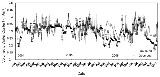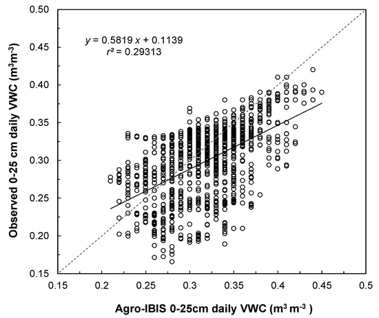 The daily average VWC (0–25 cm) simulated by Agro-IBIS was compared with observed daily average values (Figure 7). Overall, the Agro-IBIS model overestimated VWC by 10% through all years. Better simulation during the crop growth period, and overestimation of approximately 15–30% through the early winter (December) to February were observed. The similar simulation errors occurred during the winters of all years at the site. The overall correlation coefficient (r2) between simulated and observed VWC was 0.29 (Figure 8), and the simulated daily average VWC values over the three years 2004, 2005, and 2006 were 0.32, 0.32, and 0.31 m3 m−3, respectively, while the measured values were 0.32, 0.30, and 0.28 m3 m−3.