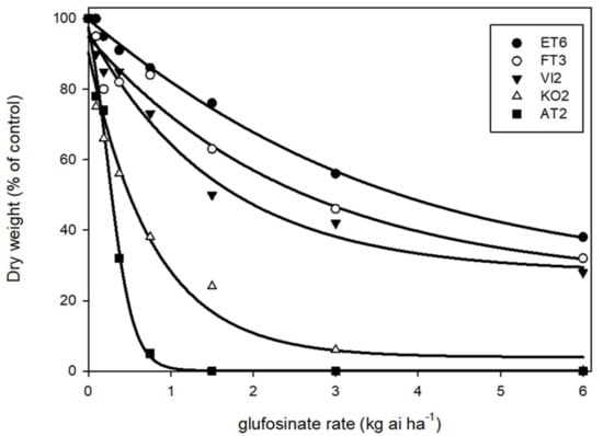 For the further determination of the level of glufosinate resistance by calculating GR50 (glufosinate rate required to kill 50% rigid ryegrass population) value, the trials were carried out with five accessions selected from the 20 accessions screened previously with glufosinate at 0.75 kg a.i. ha−1. Dose–response regression curves (Figure 1) indicate significant differences in the response of the S population (AT2) when compared with the most R populations (e.g., ET6 and FT3). The estimated GR50 values for each of the selected accessions are reported in Table 3. A glufosinate rate of 0.52 kg ha−1 caused 50% of biomass reduction in accession AT2, whereas the same reduction was achieved with 3.84 kg ha−1 in population ET6, indicating a resistance index of 7.38. It is also noticeable that the recommended rate of glufosinate (i.e., 0.75 kg a.i. ha−1) provided 95% and 16% control for AT2 and ET6 populations, respectively. In the present study, glufosinate rates required to control resistant accessions were about threeto seventimes higher than those required to control the susceptible accessions. These values were either similar to or lower than those reported for L. rigidum in Australia and Spain, respectively [19,27]. Moreover, the differences found between glufosinate-susceptible and -resistant rigid ryegrass biotypes were either equal to or higher than the corresponding values previously confirmed in other gramineous species such as L. perenne and E. indica [8,9,28].