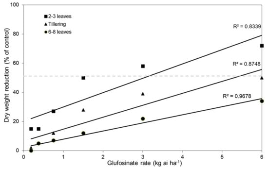 Regression of aboveground biomass response (accession VI2) of L. rigidum at different growth stages to increasing glufosinate rate. Untransformed data are shown, although regression analysis was performed using the natural log of glufosinate rate and arcsine-transformed fresh weight values (coefficient of determination, R2 values are also shown).