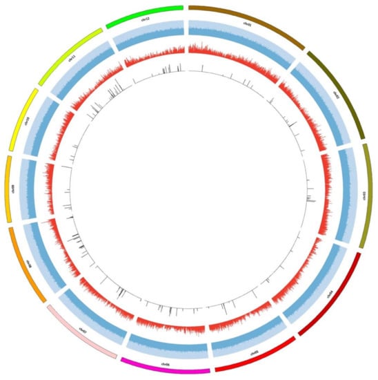 An annotated Circos plot depicts the distribution pattern of the selected SNP and InDel markers. The outermost circle represents 12 chromosomes of the rice genome. Blue bars represent the GC content of the rice genome, whereas red bars represent the gene frequency. In addition, the innermost black boxes represent the SNP and InDel markers identified in the Chinese rice cultivars.