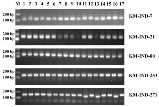 In order to detect InDel polymorphisms by electrophoresis, we performed primer screening using PCR. As an example of validation, clear single bands were detected around the expected PCR product sizes for five markers including, KM-IND-7, KM-IND-21, KM-IND-80, KM-IND-253, and KM-IND-271 (Table 3). The unique size between the amplified fragments could be discriminated among the 17 cultivars (Figure 2; Supplementary Table S1). Our validation results shown that the markers (for 17 cultivars) with a success rate of 90% or more for PCR. In the case of KM-IND-21, polymorphism could be detected for ~80% of the rice cultivars.