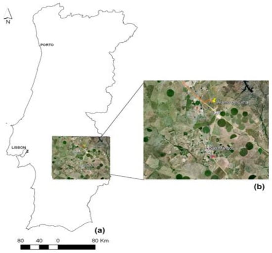 Location of the study area in southern Portugal (a) with identification of the intensive commercial olive orchard at the Herdade Álamo de Cima near Évora (38°29′49.44′’ N, 7°45′8.83′’ W; alt. 75 m), in the Alentejo region (b).