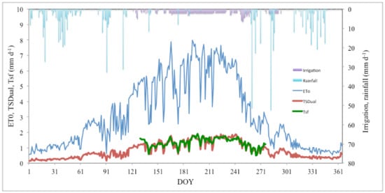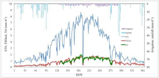 The comparison of transpiration data simulated by SIMDualKc (TSDUal) with observed data (Tsf), for the two years is shown in Figure 2, which includes ETo, rainfall, and irrigation data.