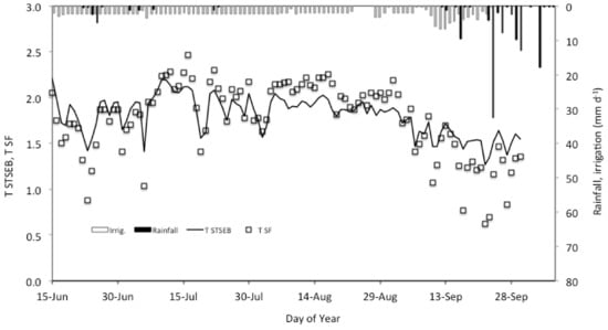 Almost 960 half-hour canopy and soil surface temperature observations were obtained from DOY 166 to 273 and were used to run and evaluate the STSEB model output. For estimation of the contribution of canopy and soil, respectively, to the total net radiation flux, Equations (8) and (9) were applied using values of αs = 0.12, αc = 0.20, εs = 0.96, and εcs = 0.985, which were characteristics of the olive canopy [28,42,43]. The soil and canopy contributions to the total sensible heat flux, Hs and Hc, respectively, were evaluated with Equations (10) and (11). Related expressions, parameters, and constants to estimate the aerodynamic resistances were obtained from literature (Appendix A in [26,29,33,44] and ancillary meteorological and biophysical measurements of key variables to the STSEB model (vd. Section 2.1, and Section 2.2). The energy required for canopy transpiration and soil evaporation was evaluated with Equations (4) and (5), and the total energy balance was estimated with Equation (3). A constant value of CG = 0.35 was used in Equation (6), corresponding to the midpoint between its likely units [33,45]. Modeled daily values of transpiration (TSTSEB) were then tested by comparison with field observed sap flow daily transpiration rates (Tsf). The comparison is shown in Figure 3, with related goodness of fit indicators presented in Table 5.