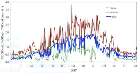 Series of ETc act (ETcSDual act) with the same length as simulated TSDual were obtained with SIMDualKc for 2014, with Figure 4 showing the time evolution of EsSDual, TSDual, and ETc act (ETcSDual act).