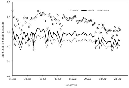 Similarly, series of ETcSTSEB were obtained with STSEB model for 2014; the time evolution of EsSTSEB, TSTSEB, and ETcSTSEB for the period in-between June 15th and September 30th is presented in Figure 5.