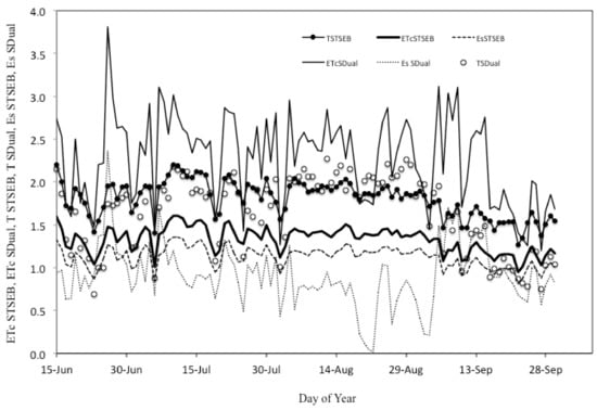To further test the STSEB model, the ETcSTSEB simulated values with Equation (3) were compared to ETcSDual values. Figure 6 presents such values, as well as the TSDual, EsSDual, EsSTSEB, and TSTSEB plots.