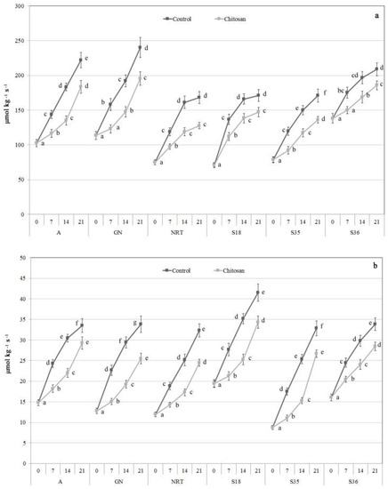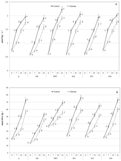 3.1. Effect of Chitosan Coating on Antioxidant Enzyme