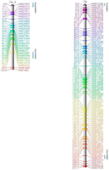 Molecular techniques have accelerated progress in plant breeding programs [14]. Of these, quantitative trait locus (QTL) mapping that is carried out to detect potential chromosome regions associated with important traits using molecular markers [15] has been proved to be an effective way to understand the genetic architecture of physiological and yield-related traits in crops [16]. In wheat, QTL mapping has been extensively conducted for PH, TKW, and GY [1,9,11,17,18,19,20,21,22,23,24] as well as for CT (or CT depression) and CCI (or SPAD), since these two traits are significantly correlated with GY and its components [9,10,11]. Some QTL for CT (or CT depression) and CCI (or SPAD) have been identified during anthesis or at 10 d (days) post-anthesis using different mapping populations and considered as potential tools for improving wheat yield under different stress environments [7,9,10,11,21,25,26,27]. QTL for CT during the vegetative and grain-filling stages have been identified on Chromosomes (Chr.) 1B, 2B, 3B, and 7A across different environments, whereas one QTL for CT during the vegetative stage has been identified on Chr. 4A [28]. Previous study reported QTL for CT during the vegetative (25 d after emergence) and grain-filling stages on Chr. 3A, 3BS, 3BL, 5B, and 7A under irrigated, heat, and drought conditions [21]. QTL for CT depression during anthesis have been mapped on Chr. 2AL, 3BL, 4BS, 5BS, and 6BL, whereas QTL for CT depression at 10 d post-anthesis on Chr. 4AS, 4BS, and 5BS [10]. QTL for SPAD at 0 d, 7 d, and 14 d post-anthesis have been detected on Chr. 1A, 1B, 1D, 2B, 3B, 4D, 6B, and 7B under unstressed conditions [29]; on Chr. 1A, 2B, 3A, 4A, 4D, 5B, and 6A at 0 d, 7 d, and 14 d post-anthesis under high-light stress conditions [7]; on Chr. 3D and 7A at the seeding stage under salt stress conditions [26]; on Chr. 7A during anthesis under different nitrogen and water conditions [25]; and on Chr. 1B and on 1A, 1D, 3A, 3B, and 5A under heat and drought conditions [28]. Previous study reported QTL for SPAD during anthesis on Chr. 2AS, 2AL (2), 2DS, 2DL, 3AS, 4AL, 4DS, 5AS, and 5AL, and at 10 d post-anthesis on Chr. 2AL (2), 2BS, 2D, 5AL, 5BL, 6AS, and 7A [11].